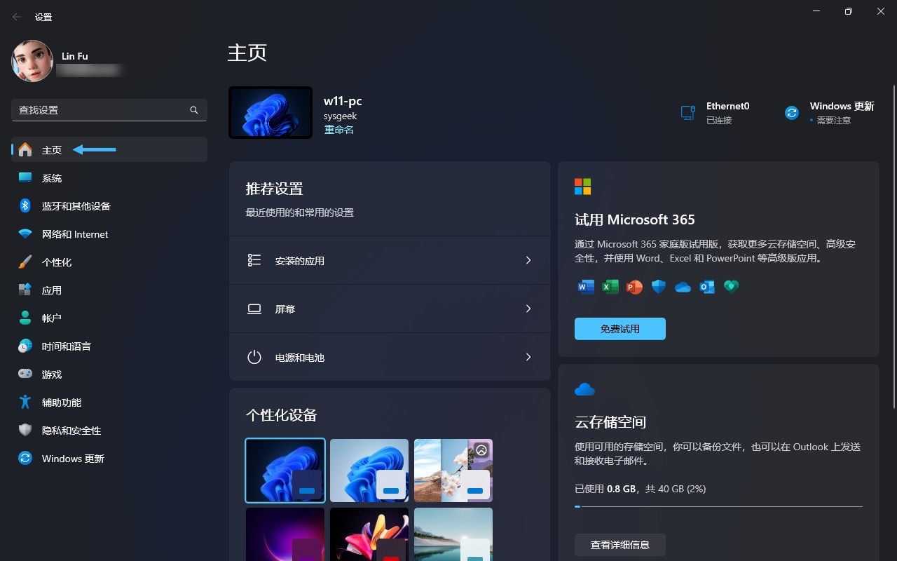 不过,这种设计也引发了一些争议。部分用户认为这些用来推广 microsoft 365、onedrive 和 game pass 等服务的卡片,更像是广告。如果你希望隐藏「主页」选项卡,回归传统的「设置」界面,可以参考以下两种方法。