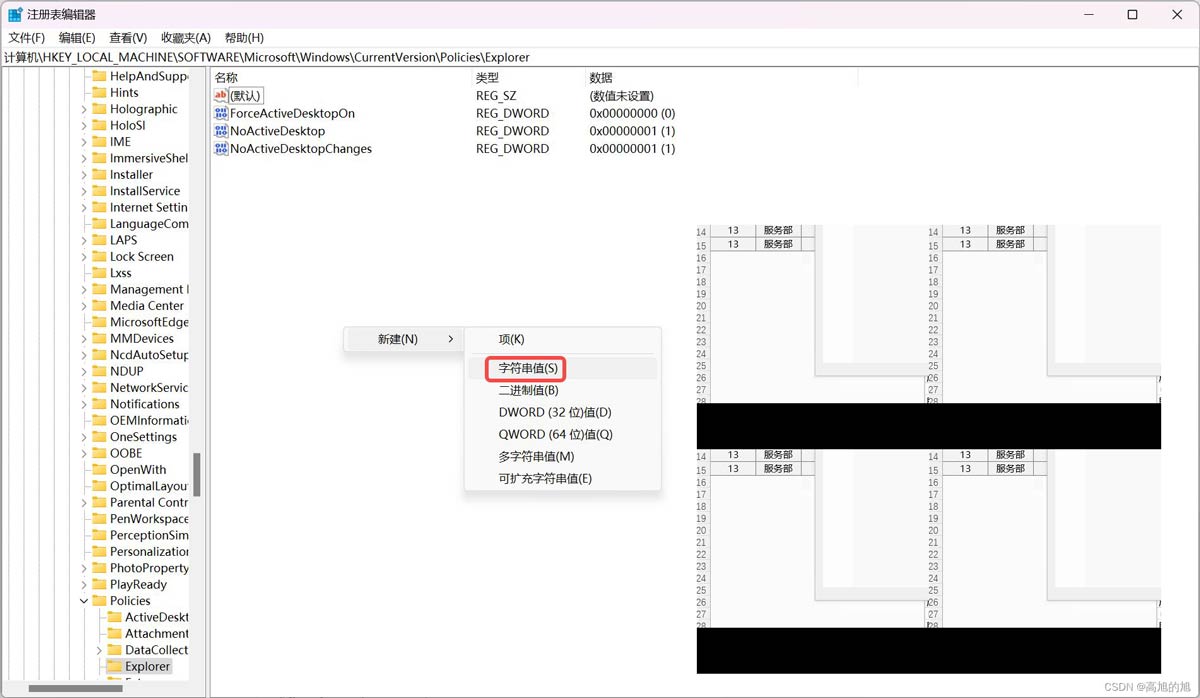 3、在explorer项下,新建一个名为settingspagevisibility的字符串值。