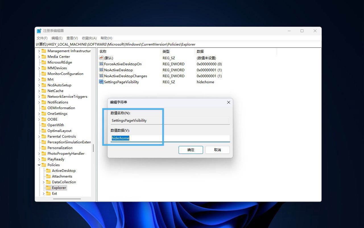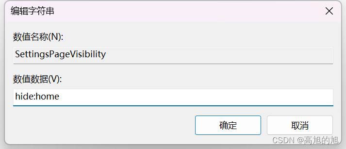4、双击新建的字符串值,将其值设置为hide:home,这样就可以隐藏「主页」。