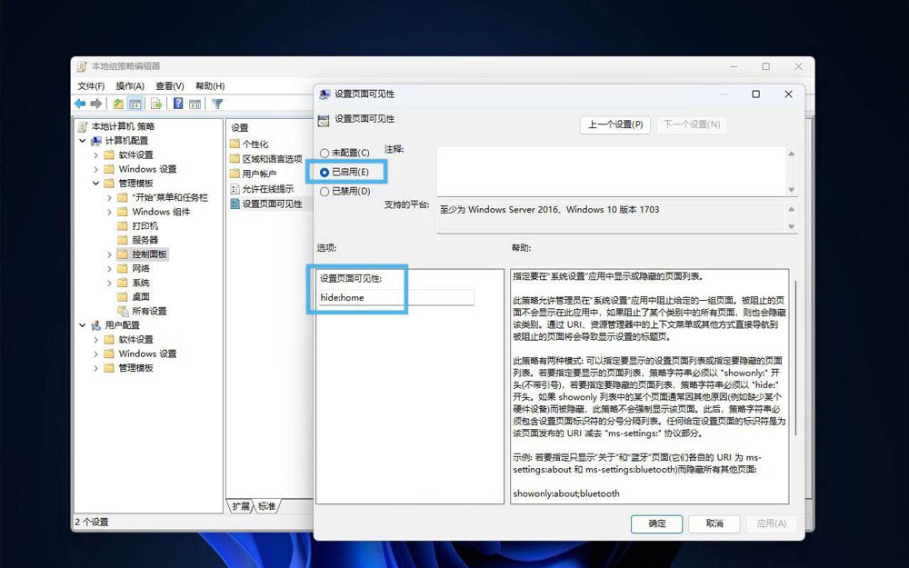 如果使用的是 windows 11 专业版,还可以通过更改组策略来隐藏「设置」应用中的「主页」: