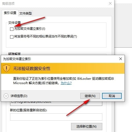 4、第四步,进入“高级选项”页面之后,我们在该页面中点击勾选“为加密文件建立索引”选项,然后在弹框中点击“继续”选项