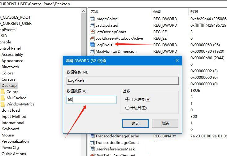 5、此时,再找到并双击打开其中的“logpixels”,输入想要修改的数值数据值,点击确定即可。
