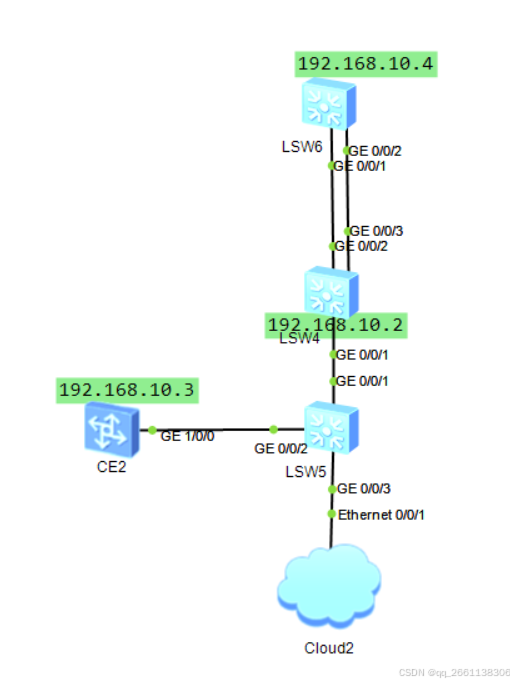 int eth-tr 1 mode lacp trunkport g0/0/1 trunkport g0/0/2 //配置聚合链路 int vlan 1 ip add 192.168.10.4 24 //使用该地址登录设备 ospf area 0 net 0.0.0.0 0.0.0.0 //与lsw4建立ospf邻居关系