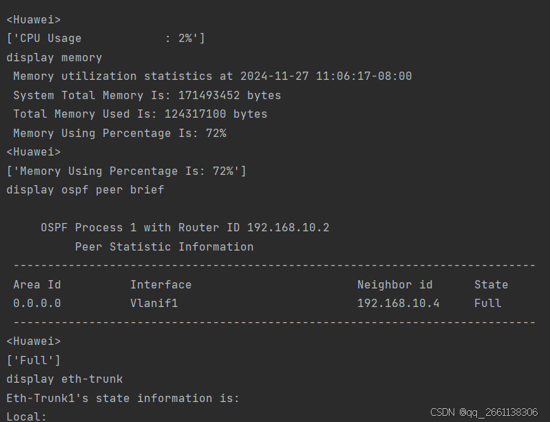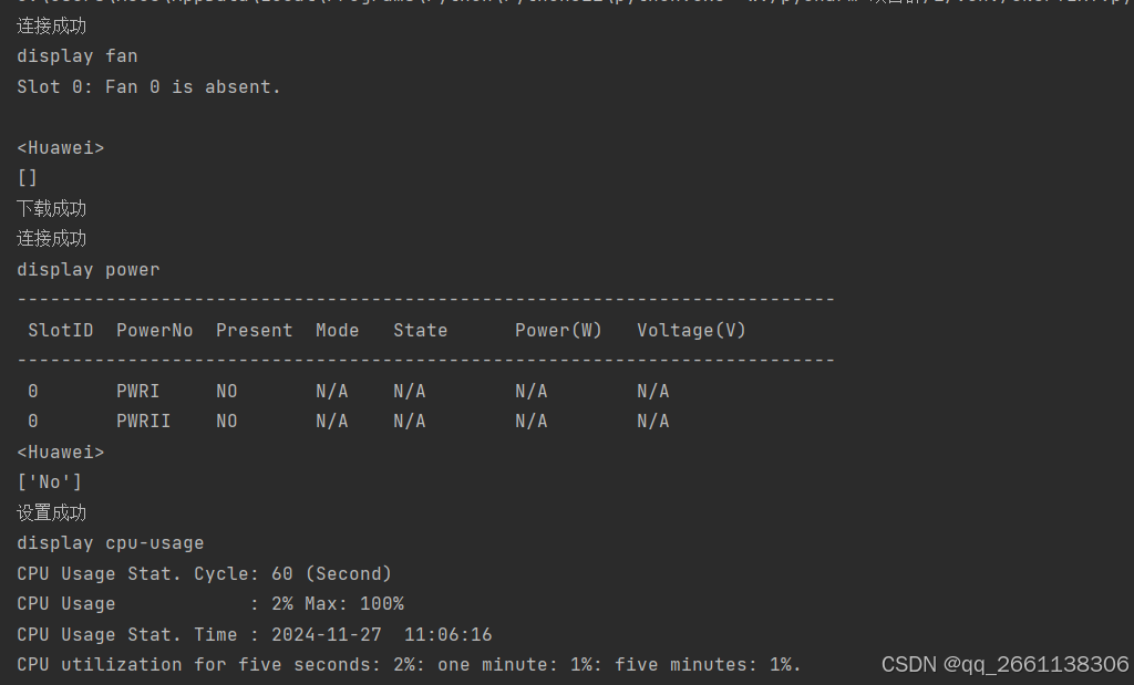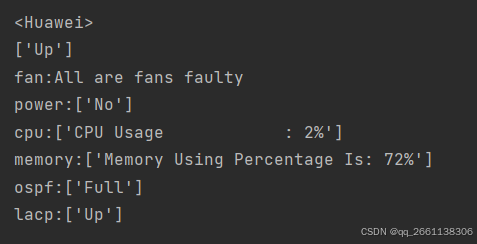 内容如下所示,运行后会查看该设备的风扇状态,电源状态,cpu利用率,内存使用率,ospf邻居状态,以及聚合链路状态。