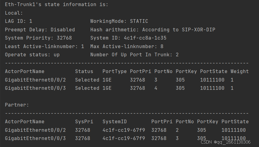 interface eth-trunk1 mode lacp-static # interface gigabitethernet0/0/2 eth-trunk 1 # interface gigabitethernet0/0/3 eth-trunk 1 //聚合链路 ospf 1 area 0.0.0.0 network 0.0.0.0 255.255.255.255 //配置ospf协议