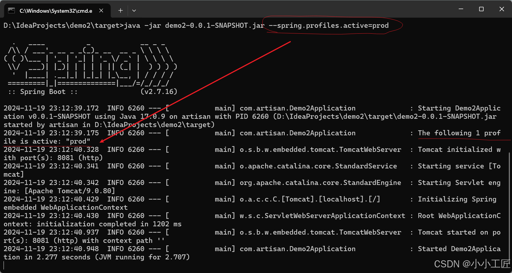 在项目打包成 jar 文件后,可以通过命令行参数 --spring.profiles.active 指定环境。例如: