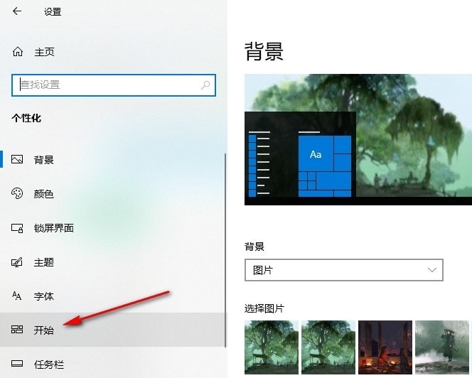 3、第三步,进入个性化设置页面之后,我们在该页面中点击打开“开始”选项