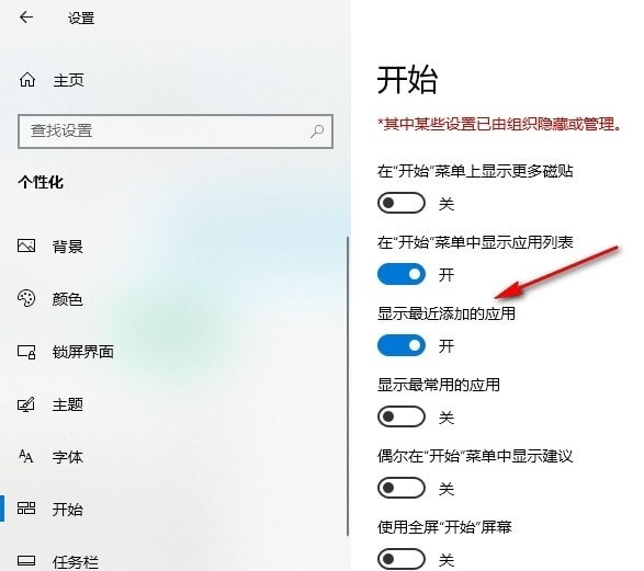 4、第四步,接着我们在“开始”的右侧页面中找到“显示最近添加的应用”选项