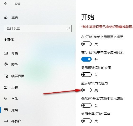 5、第五步,最后我们将“显示最近添加的应用”选项下的开关按钮点击关闭即可