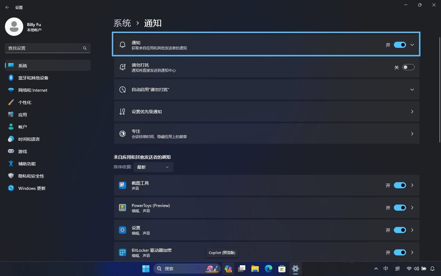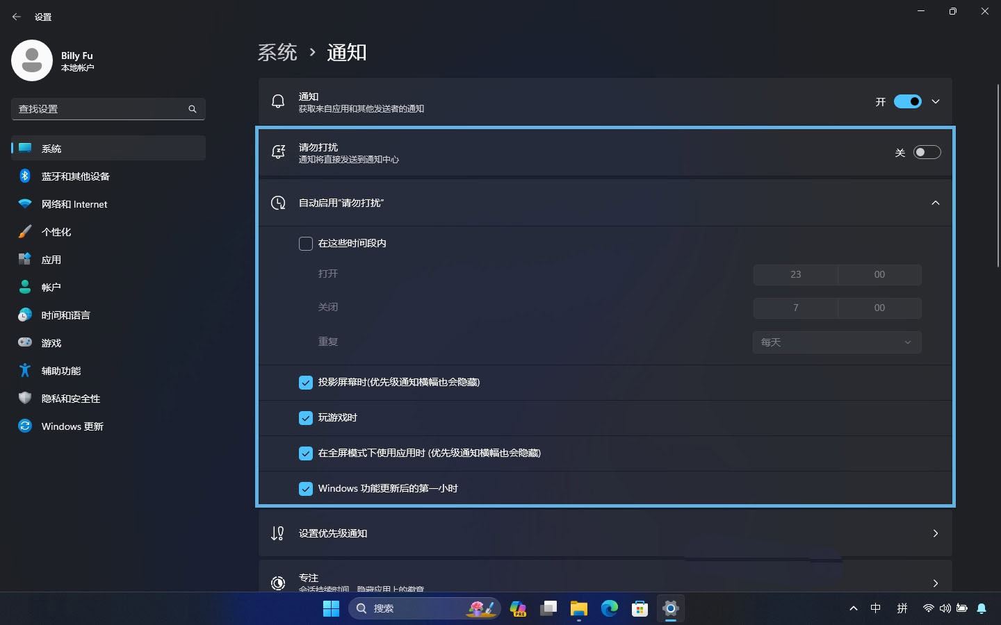 windows 11 中的「请勿打扰」功能允许你在不关闭通知的情况下,临时屏蔽通知弹窗和声音提示: