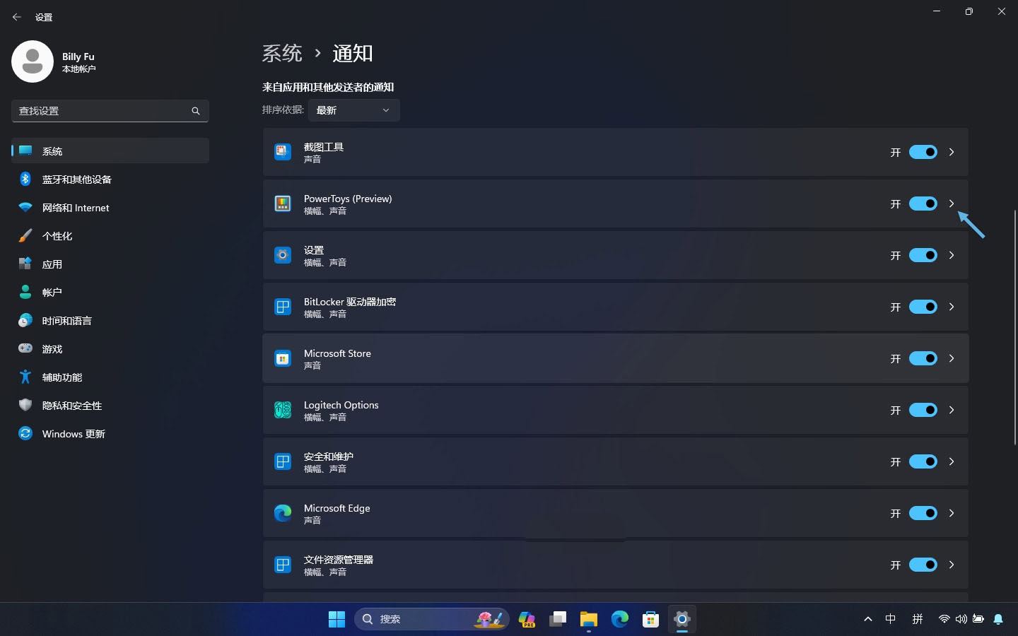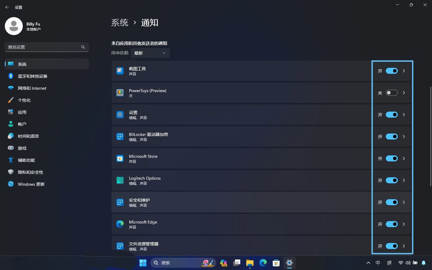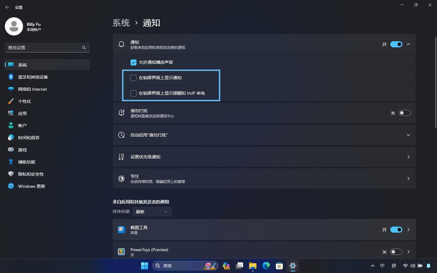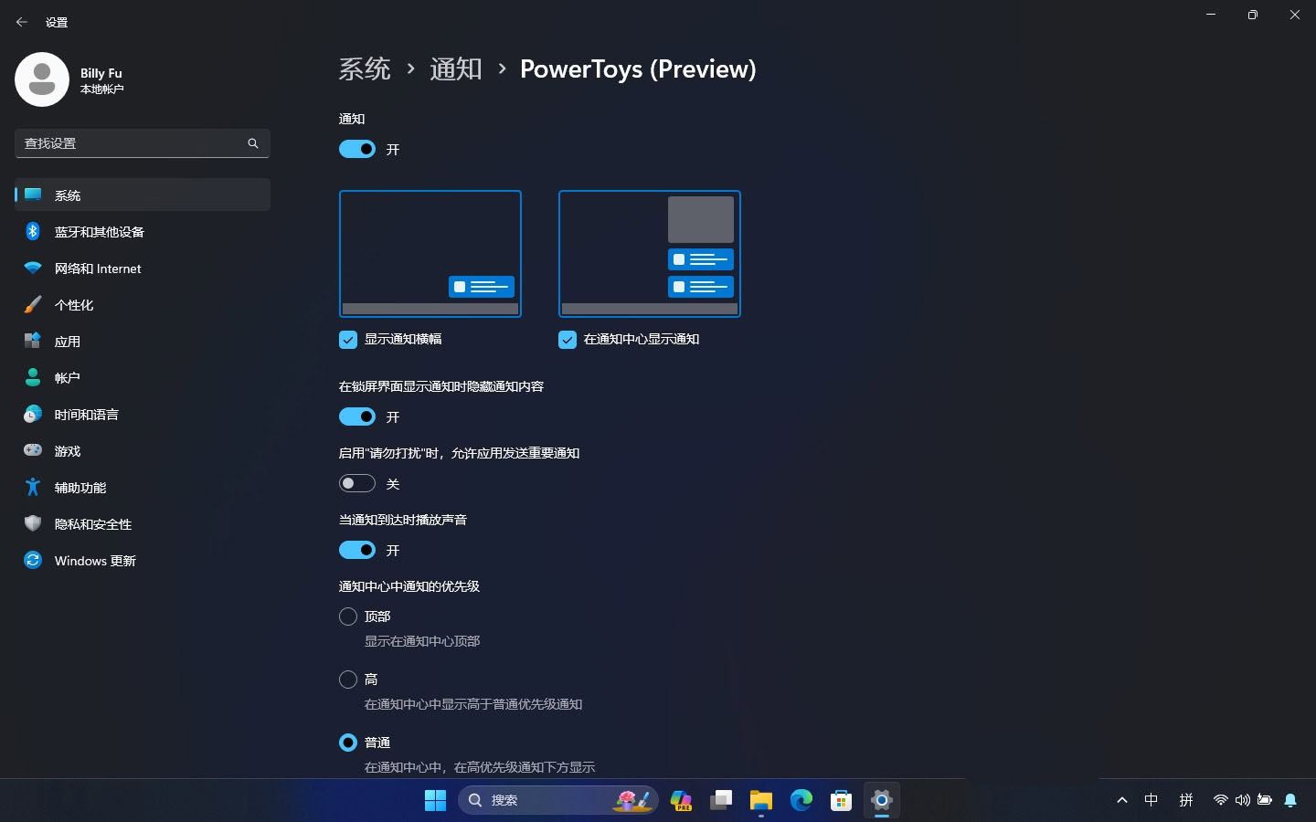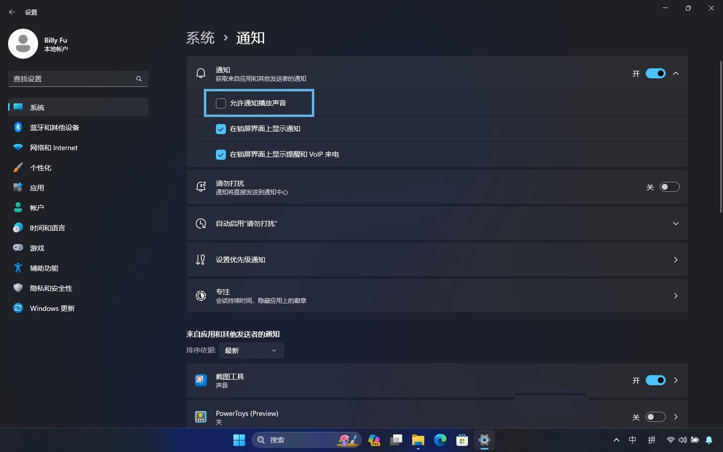 windows 11 允许对每个应用的通知方式进行个性化设置,包括是否弹窗、提示声音和在「通知中心」中的优先级等: