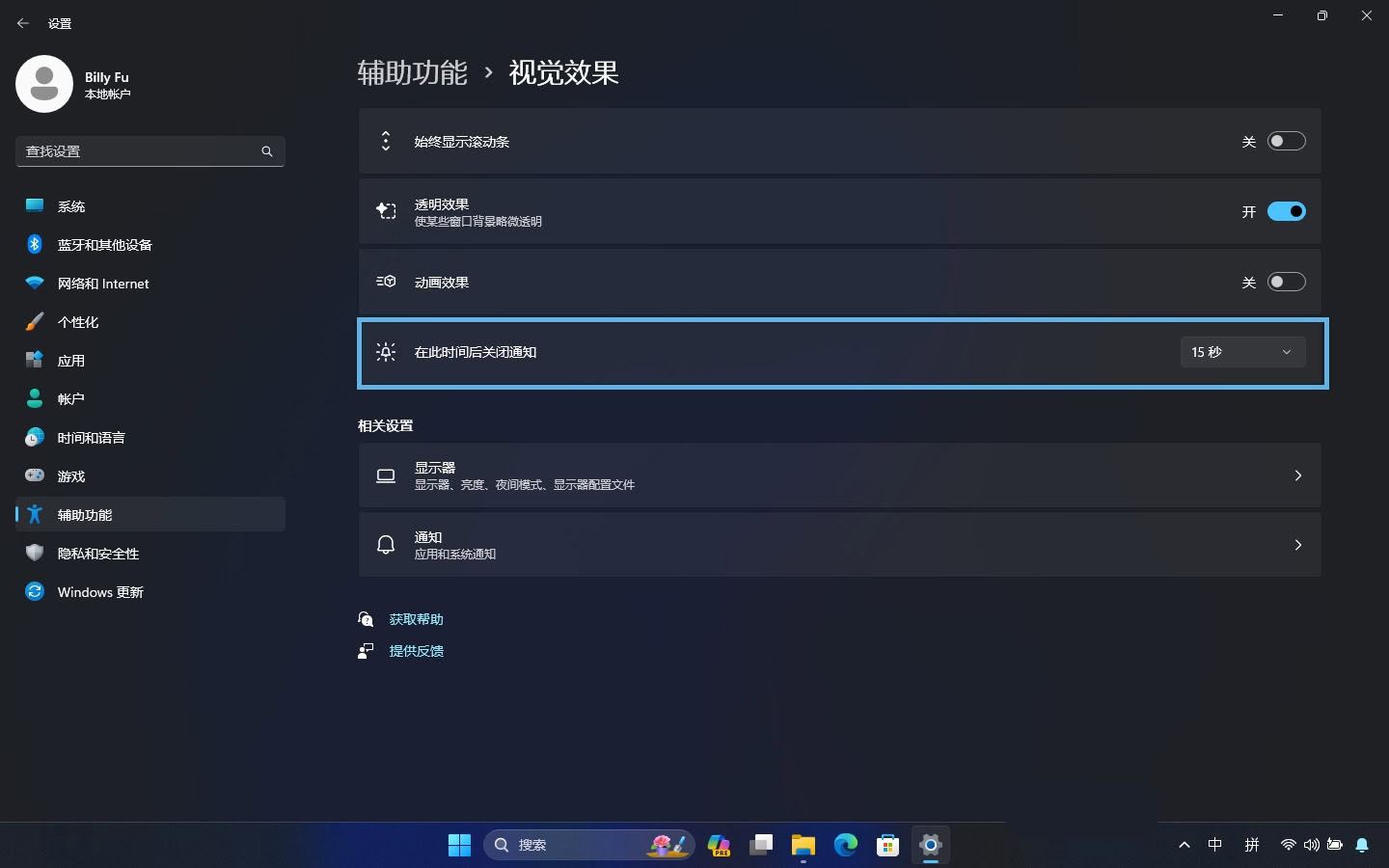 2、在「在此时间后关闭通知」下拉列表中,选择一个合适的显示时长(默认为 5 秒)。
