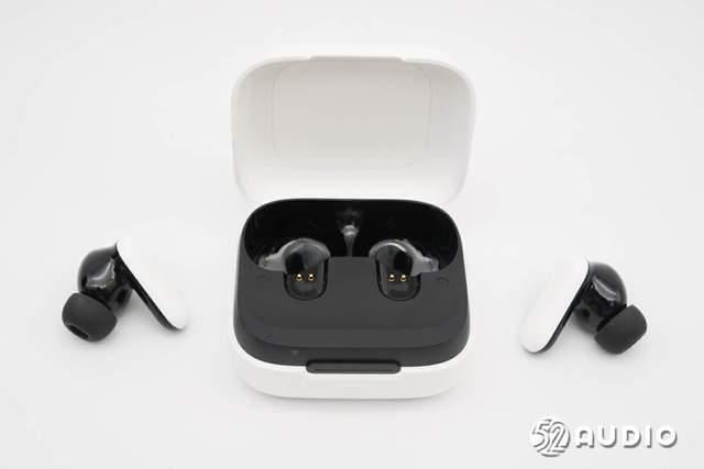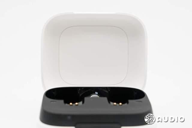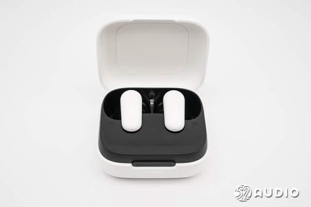 打开充电盒盖,内部座舱与外壳采用了黑白撞色设计,耳机平方在座舱内,磁吸固定,能够便捷取放。