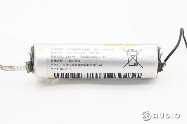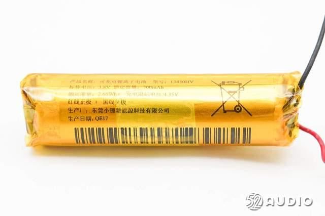 撕开绝缘保护,电池上标签信息一览,可充电锂离子电池,型号:13450hv,标称电压:3.8v,额定容量:700mah,额定能量:2.66wh,充电限制电压:4.35v,生产厂:东莞小锂新能源科技有限公司。