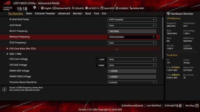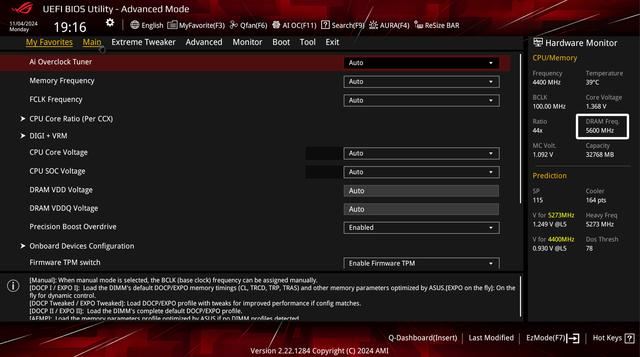 首先我们进入华硕 rog crosshair x870e hero主板的bios,从右侧白框处可以看到,十铨科技xtreem 玄境ddr5 8200mhz 24gbx2的jedce频率为5600mhz(简单理解就是未开xmp或expo时的默认频率),我们啥也不做,按f10保存退出,看一看其内存性能表现。