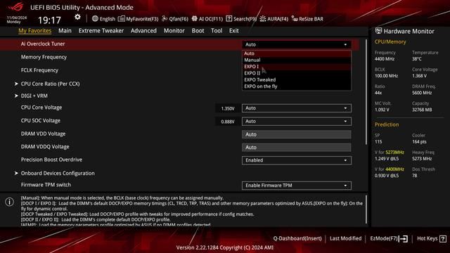紧接着,我们再度重启电脑进入bios,在ai overlock tuner中便可开启expo,其中,expo ⅰ与expo ⅱ都是内存内置的expo参数,本内存除了8200mhz的expo频率之外,还有一组6000mhz 1.25v的低电压频率可选,喜欢玩压低时序的朋友也可以用此组expo进行起步,我这里就不涉及了,安心做8200mhz下的测试。