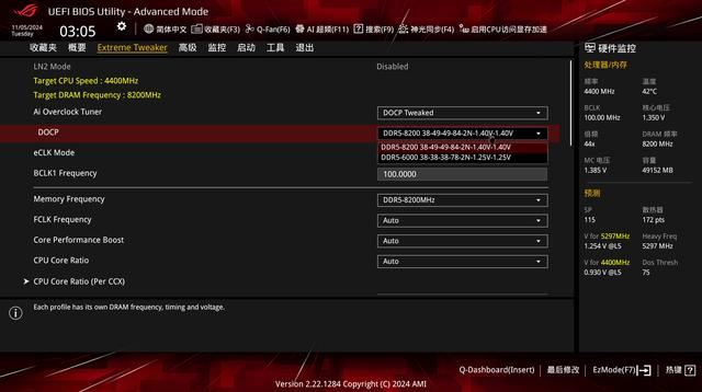 当然,这还不是十铨科技xtreem 玄境ddr5 8200mhz 24gbx2这款内存的极限,紧接着我们进行压小参,华硕将一键压小参直接集成在了ai overlock tuner中,只要选择expo tweaked即可进行一键超小参。