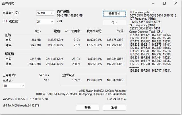 此时,本电脑7-zip的压缩得分197.478 gips,解压缩得分 202.409 gips,总得分200.107 gips,提升不明显。