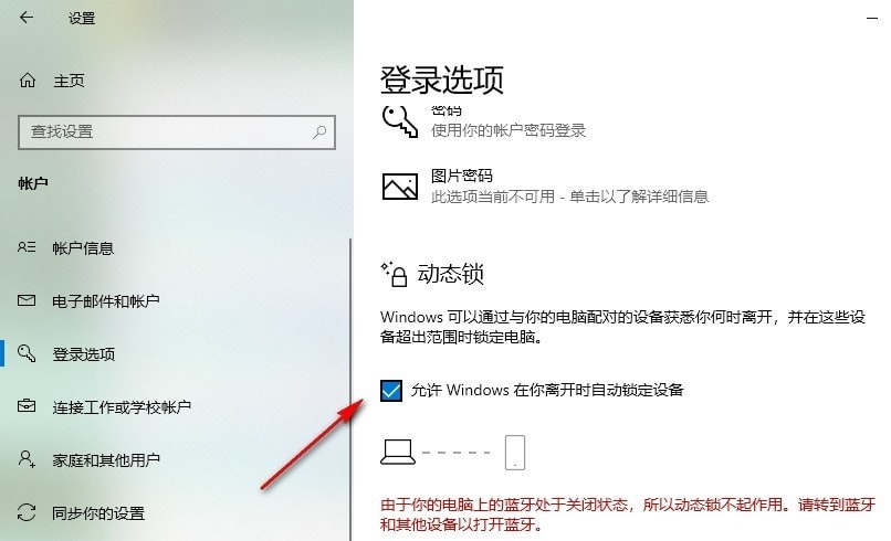 5、第五步,最后在登录选项页面中,我们找到动态锁工具,然后点击勾选“允许windows在你离开时自动锁定设备”选项即可