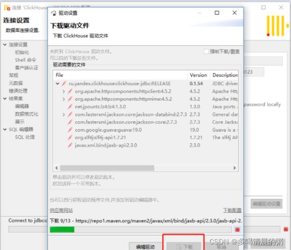 到了这一步,说明连接配置信息填写完成,如果库没有设置,就可以按照上面的第二种方法点击测试链接,在弹出来的地方选择下载按钮,等它全部下载完驱动后即可测试连接。