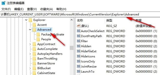 3、第三步,进入注册表编辑器页面之后,我们在路径框内输入“计算机hkey_current_usersoftwaremicrosoftwindowscurrentversionexploreradvanced”,然后点击回车键