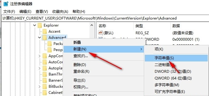 4、第四步,接着右键单击“advanced”,然后选择“新建字符串值”选项,并将新字符串命名为“disabledhotkeys”