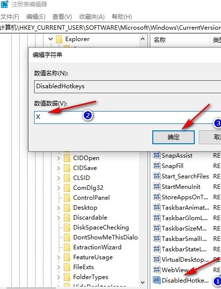 5、第五步,最后我们双击打开“disabledhotkeys”,然后在弹框的数值数据框内输入“x”,再点击确定选项即可