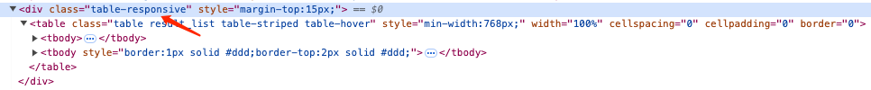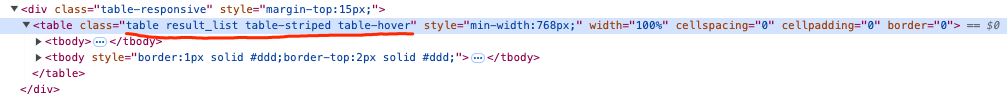 观察一下上面的 html 结构,table 表格的最外层有一个 div,它还有个 class 属性:table-responsive,假设这个 div 的 class 属性是整个 html 里独一无二的,那么我们就可以很放心的去查找 div.table-responsive 下的 table,进而精确定位我们想要的元素。