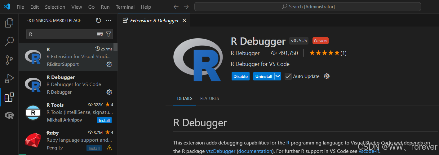在vscode的安装插件部分输入r,如下所示: