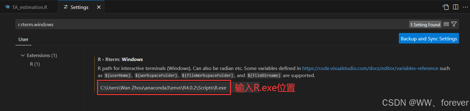 说明:r.rterm.windows配置项用于指定 r 执行路径,即 r 的终端程序路径。在 vs code 中,r 的运行依赖于这个路径的正确设置。