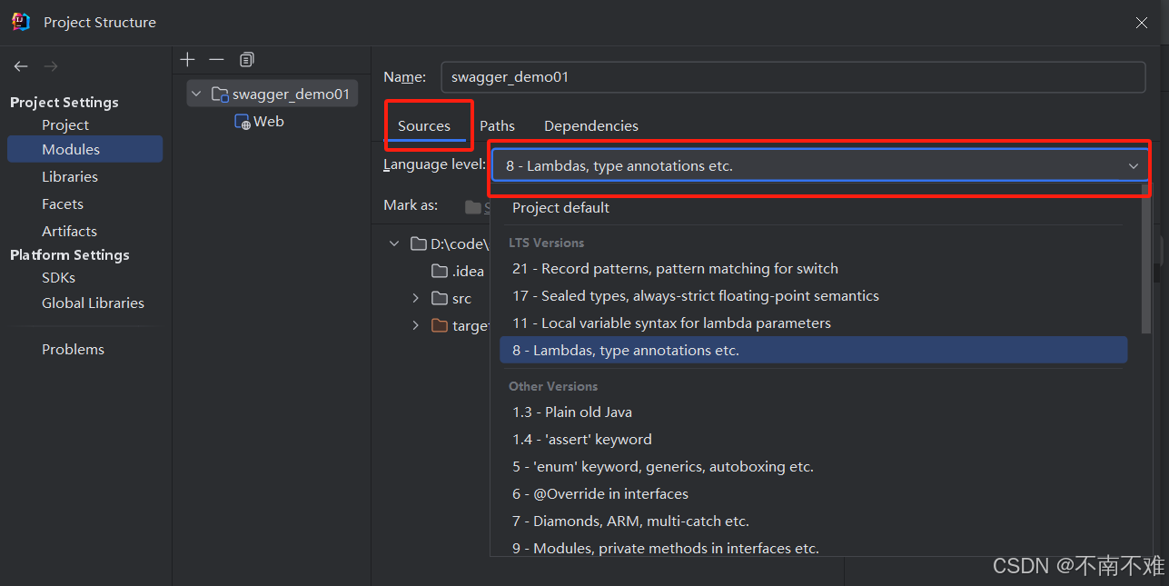 2、在modules中source的language level中确保版本和所需版本一致
