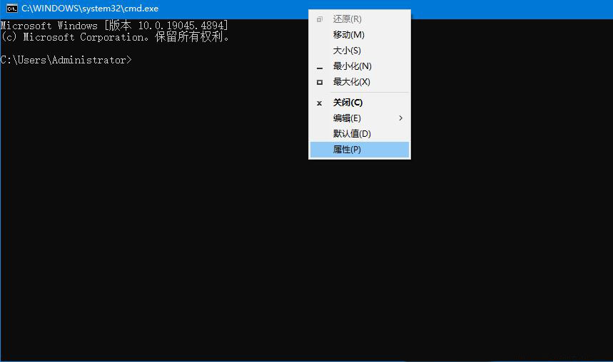 2、接着,在打开的命令提示符窗口中,右键选择打开“属性”界面。