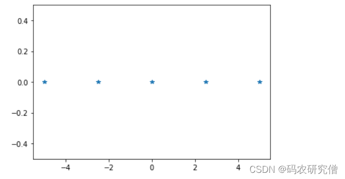 import numpy as np import matplotlib.pyplot as plt x1 = np.linspace(-5, 5, 5) # 让y直接为0 y = np.zeros(5) # 画图,具体用*号表示 plt.plot(x1, y, '*') # 设置当前轴的y限制 plt.ylim([-0.5, 0.5]) plt.show() # 输出 [-5. -2.5 0. 2.5 5. ] print(x1) # 输出的长度为 5 print(len(x1))