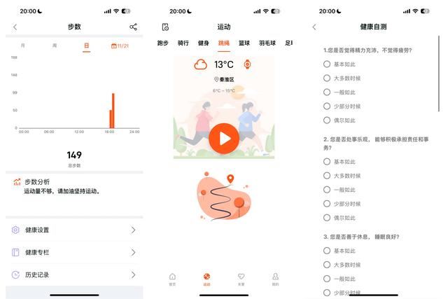 除了基础健康数据统计以外,dido的app还可以提示所在地区天气+温度、根据问卷进行心理分析和提示当日运动量等,这些附加小功能还是挺实用的。