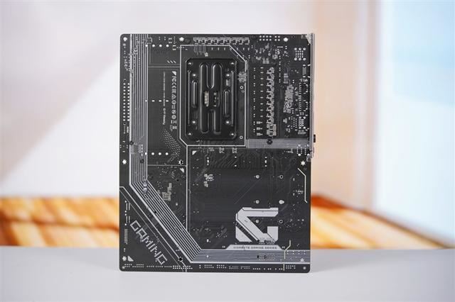 主板背面没有设计背插,只有一块cpu背板和大面积丝印的“g”和“gaming”图案。