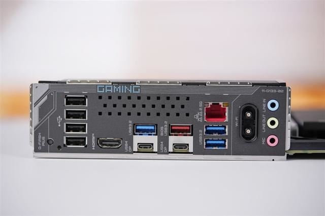 技嘉x870 gaming x wifi 7主板也采用了一体式io面板,从左到右分别是4 x usb 2.0接口,hdmi接口,蓝色的全尺寸usb 3.2 gen 1接口,红色的全尺寸usb 3.2 gen 2接口,2 x usb4 type-c接口,2.5g有线网口,2 x 全尺寸usb 3.2 gen 1接口,支持快插的wi-fi 7天线插口和标准音频接口。