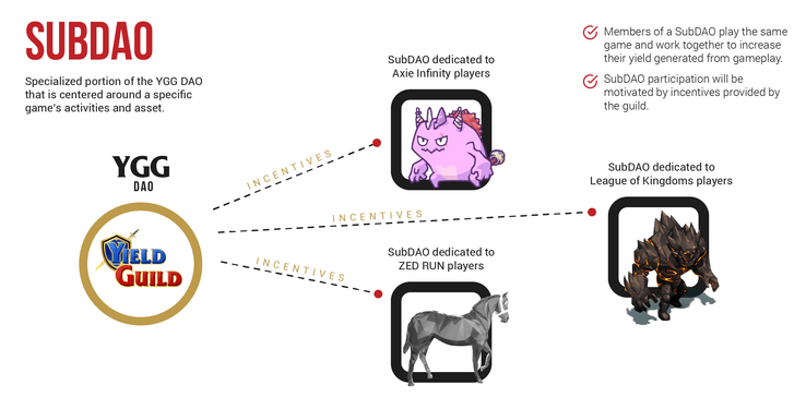 在ygg 中,不仅有参与ygg 整体治理的dao,还有专注于每个游戏的活动和资产的子dao。例如,适用于axie infinity 玩家的subdao、适用于zed run 玩家的subdao 等。