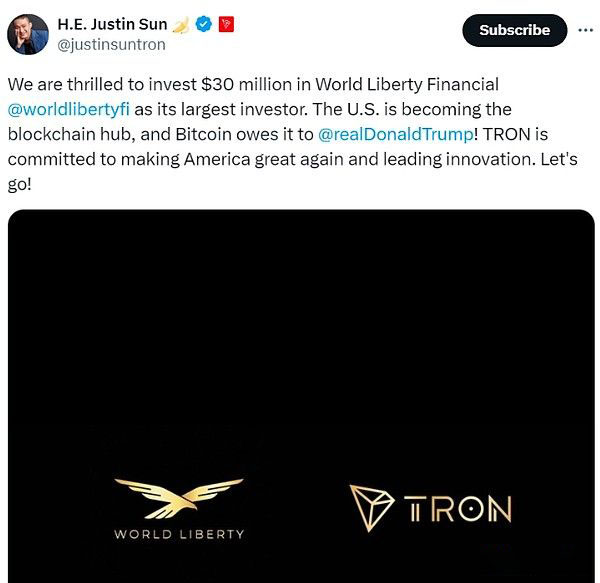 trx创下历史新高之前,tron创始人justin sun透露,在11月25日向wlfi代币投资3000万美元后,他已成为唐纳德·特 朗普加密项目的最大投资者。