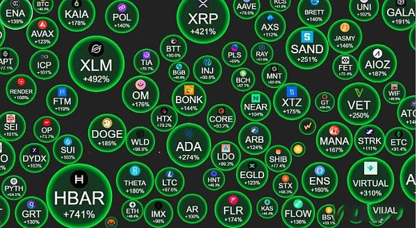 cryptobubbles 数据显示,hedera (hbar) 代币在过去一个月上涨了 763% 以上,成为 11 月份 100 种最大加密货币中表现最好的代币。