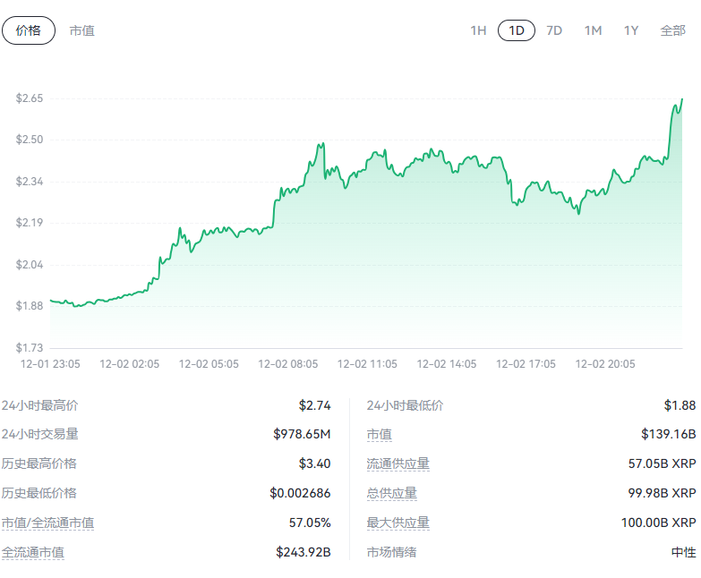 为什么xrp价格今日飙升?单月上涨400%还能买吗?12月能创历史新高吗?12月2日,xrp市值超越usdt及solana,位列加密货币市值榜第三,更是超越拼多多,升至全球主流资产第 138 位。而随着xrp上涨突破2美元,这也成功创下自2021年4月以来的新高。xrp起飞前夕ripple ceo就曾表示特 朗普政府为加密行业带来新希望,xrp或迎来转机。出乎很多投资者预料的事是,这个转折来得又快又猛,近一个月xrp币价涨幅达400%。不过如此高的涨幅下,现在还能上车xrp吗?