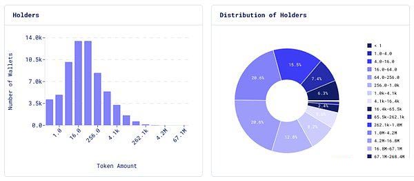 大多数持有 hype 的钱包持有 16 到 64 个代币。持有人分布如下: