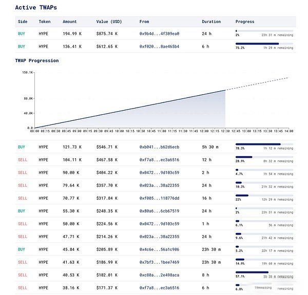hyperliquid 的 twap 功能似乎充满吸引力,许多钱包选择在较长时间段买入或卖出 hype 代币,从而减少了价格的大幅波动。