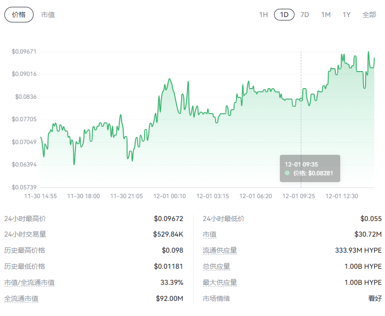 hyperliquid 于 2024-11-30创造了高达 $0.098 的历史最高价,而其目前交易价为$0.092。