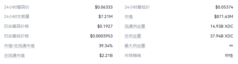 xdc network的当前市值为$871.63m,因为xdc的流通供应量为14.93b xdc,当前交易价格为$0.05838。