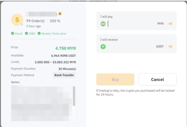 2、在买币页面,您可以根据交易需求输入所需币种、金额、法币、付款方式等条件,筛选广告方。