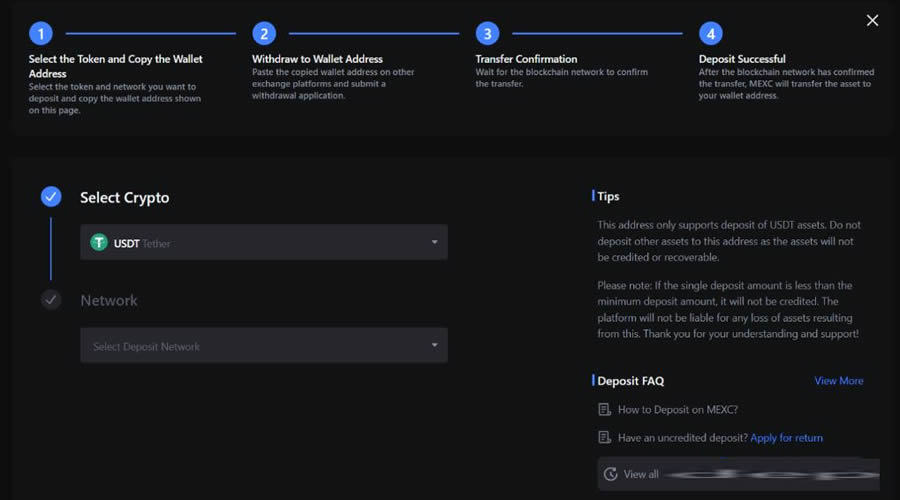 如果您希望存入加密货币,请转到“钱包”部分并选择“存款”。选择您要存入的加密货币(例如,比特币或以太坊)。mexc 将为您提供该特定加密货币的唯一钱包地址。小心复制此地址 – 任何错误都可能导致资金损失。现在,将资金从外部钱包发送到此地址。
