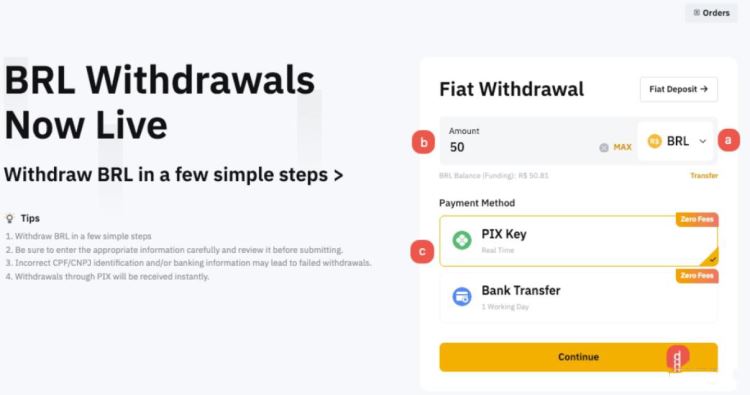 3、进入页面之后,以此选择法币种类、提现金额、支付方式,然后点击继续就完成提现。