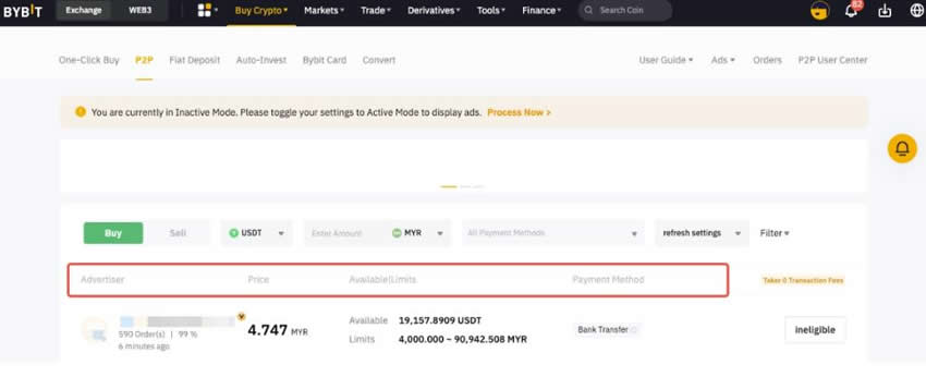 1、打开bybit(官方注册、官方下载),首页点击点选导览列左上角的快速买币→p2p交易,进入p2p交易页面。