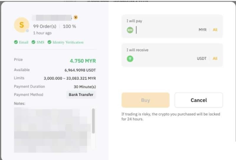 2、在买币页面,您可以根据交易需求输入所需币种、金额、法币、付款方式等条件,筛选广告方。