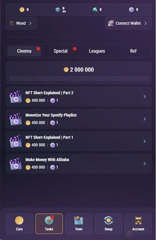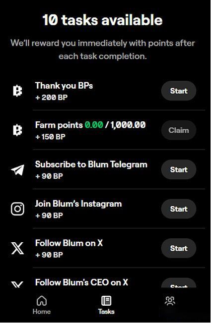 目前,blum 的交易功能尚未上线,主要推出了 tap to earn 小游戏——用户可以通过点击屏幕与小游戏获得积分,目前据 blum 项目方自称已经通过小游戏挖矿赚积分的模式获得了超过 1000 万用户。